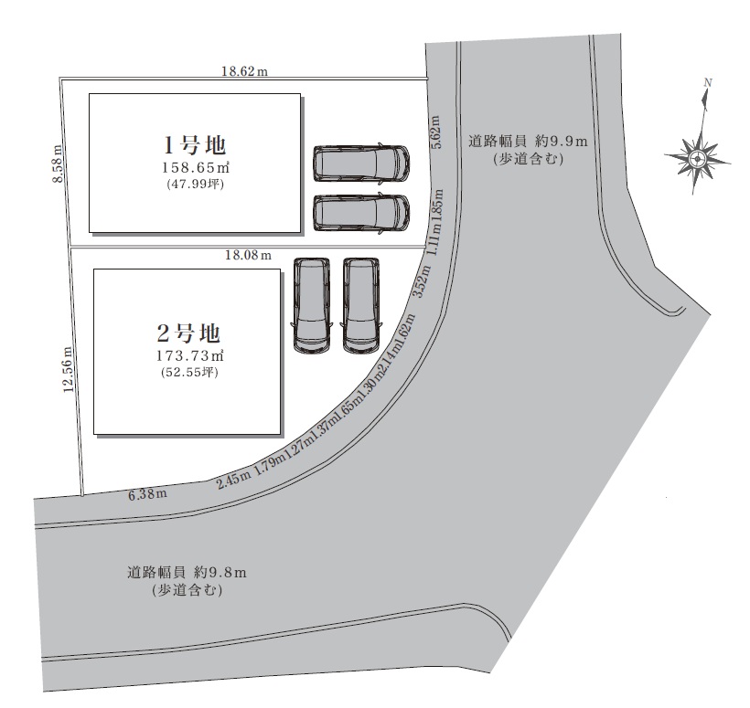 | 道路幅員 | 南側 約9.8m、東側 約9.9m |